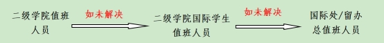 国际处/留办安排的总值班为三级值班人员。在二级值班人员不能处理的情况下,可报三级值班人员处理。